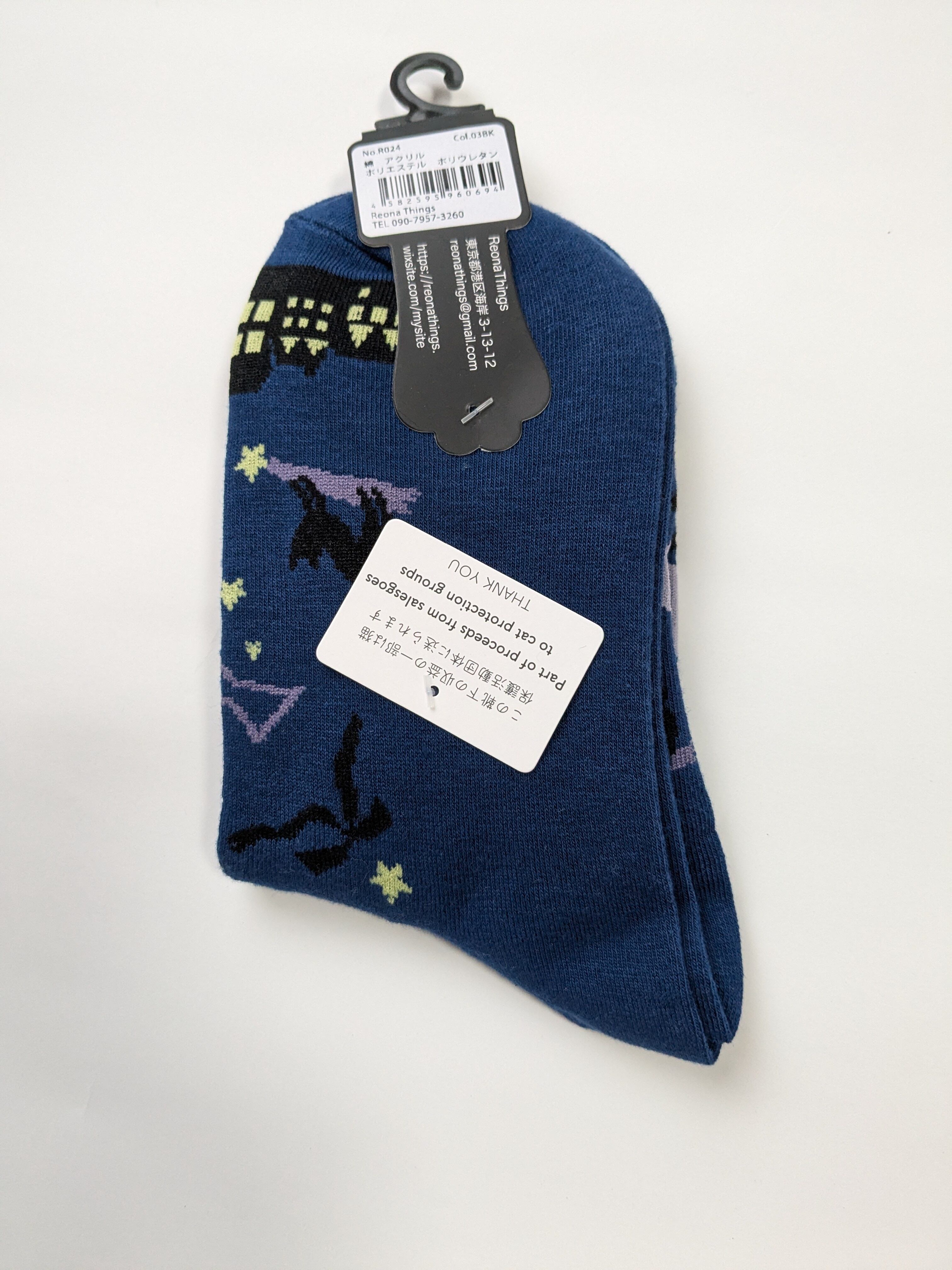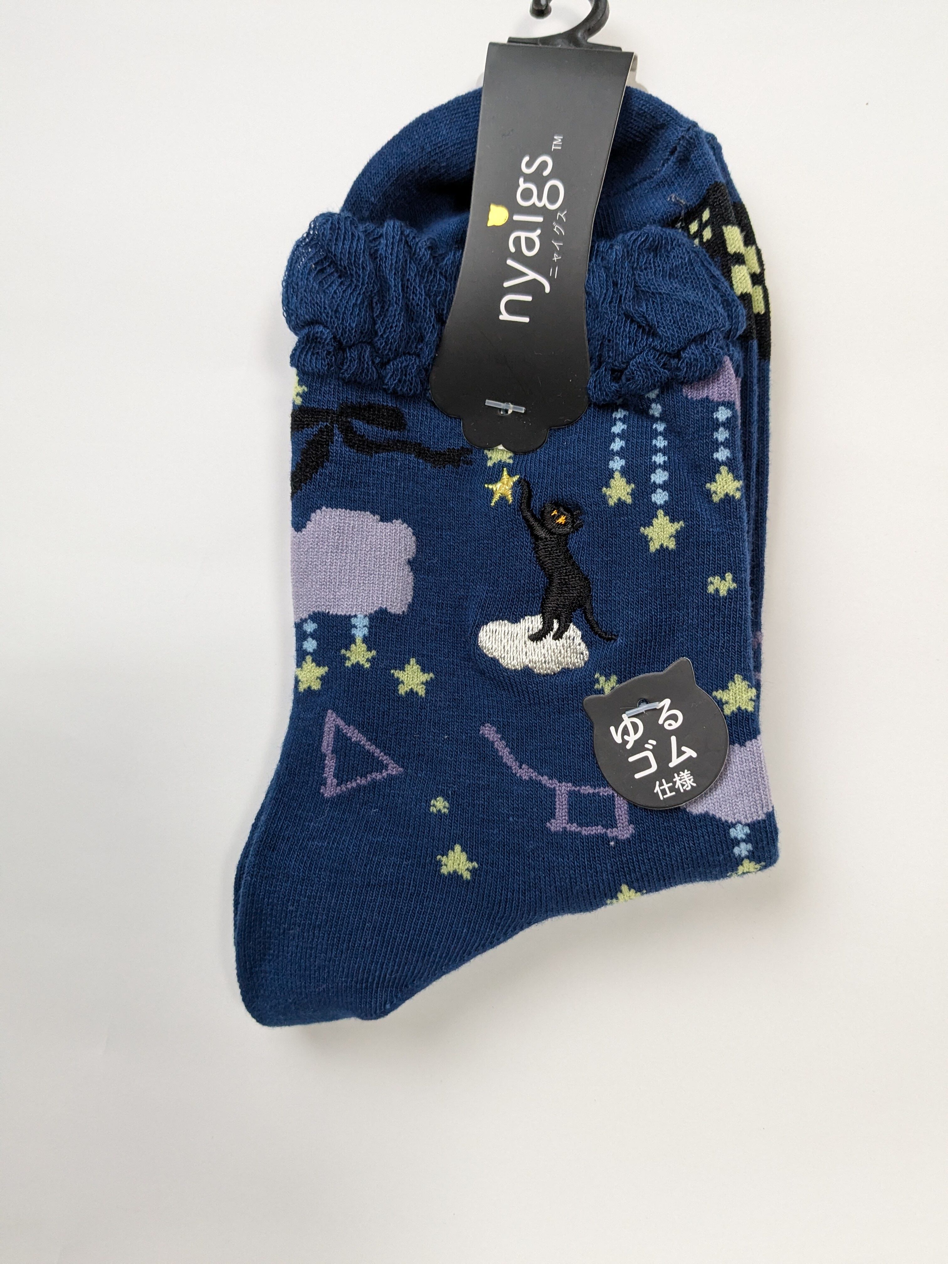 星と自由に遊ぶ猫さんを見て選ぶ人も履く人も楽しい気持ちになれたらいいな。刺繍は毛並みまで丁寧に表現されています。