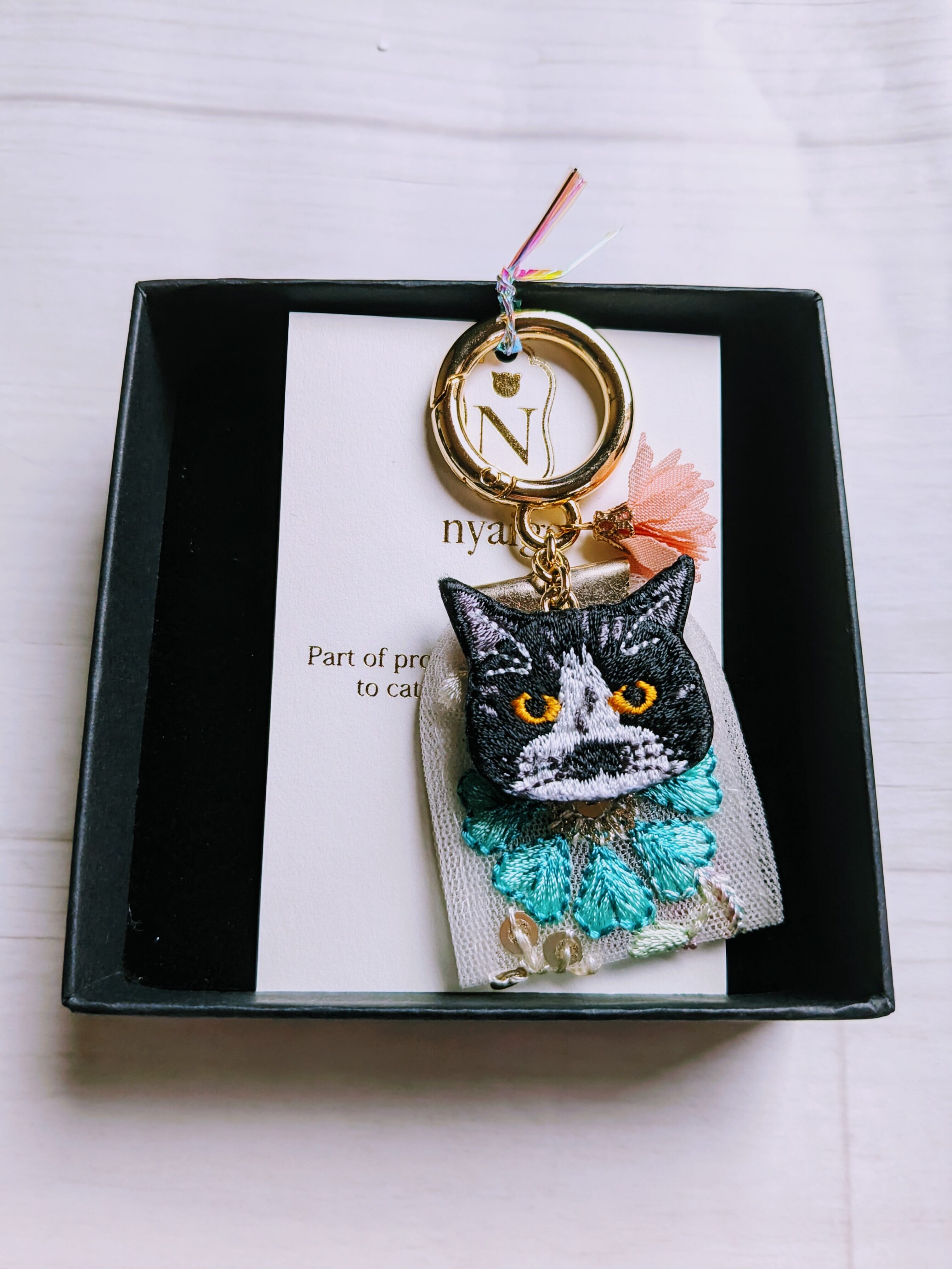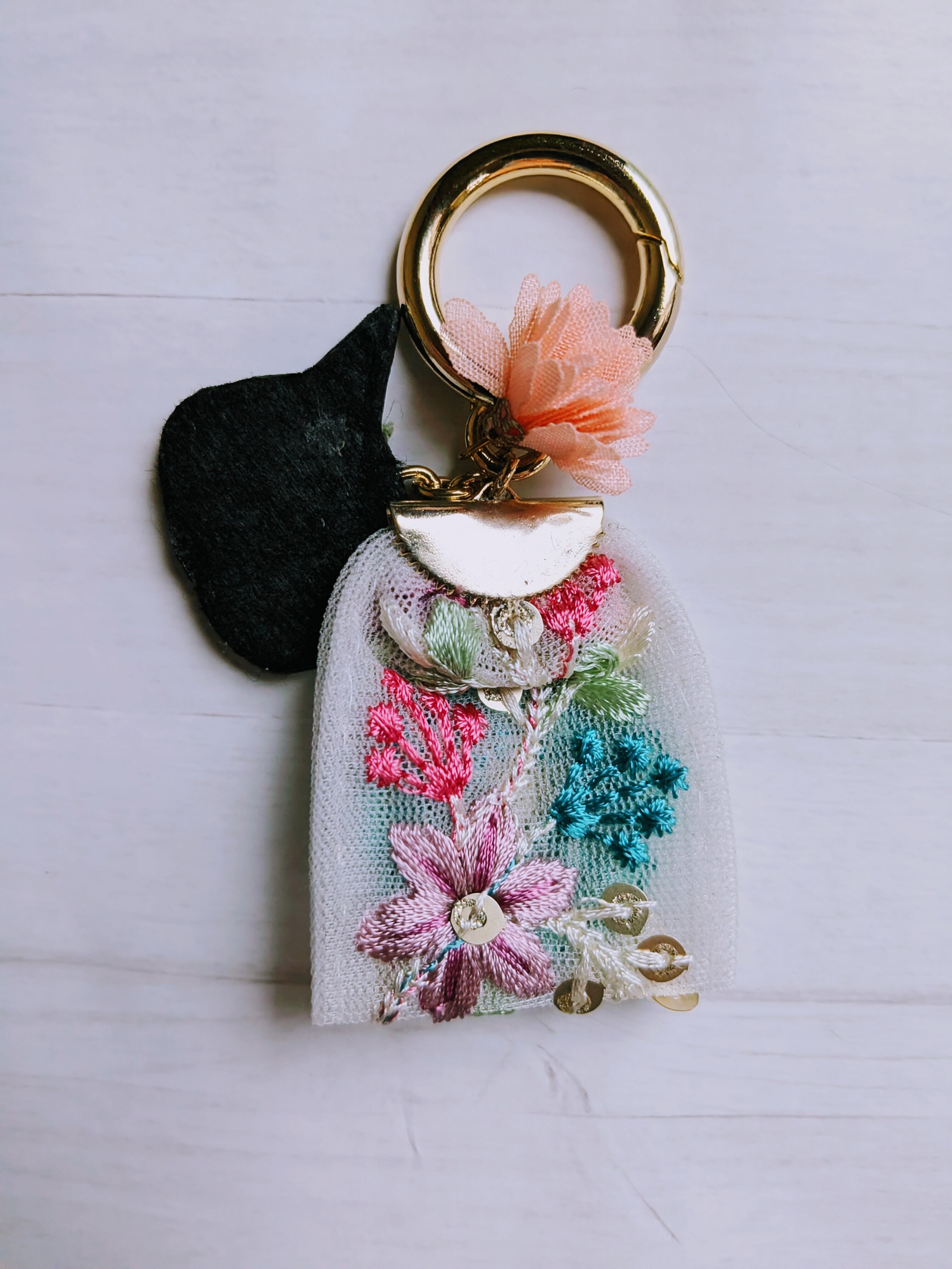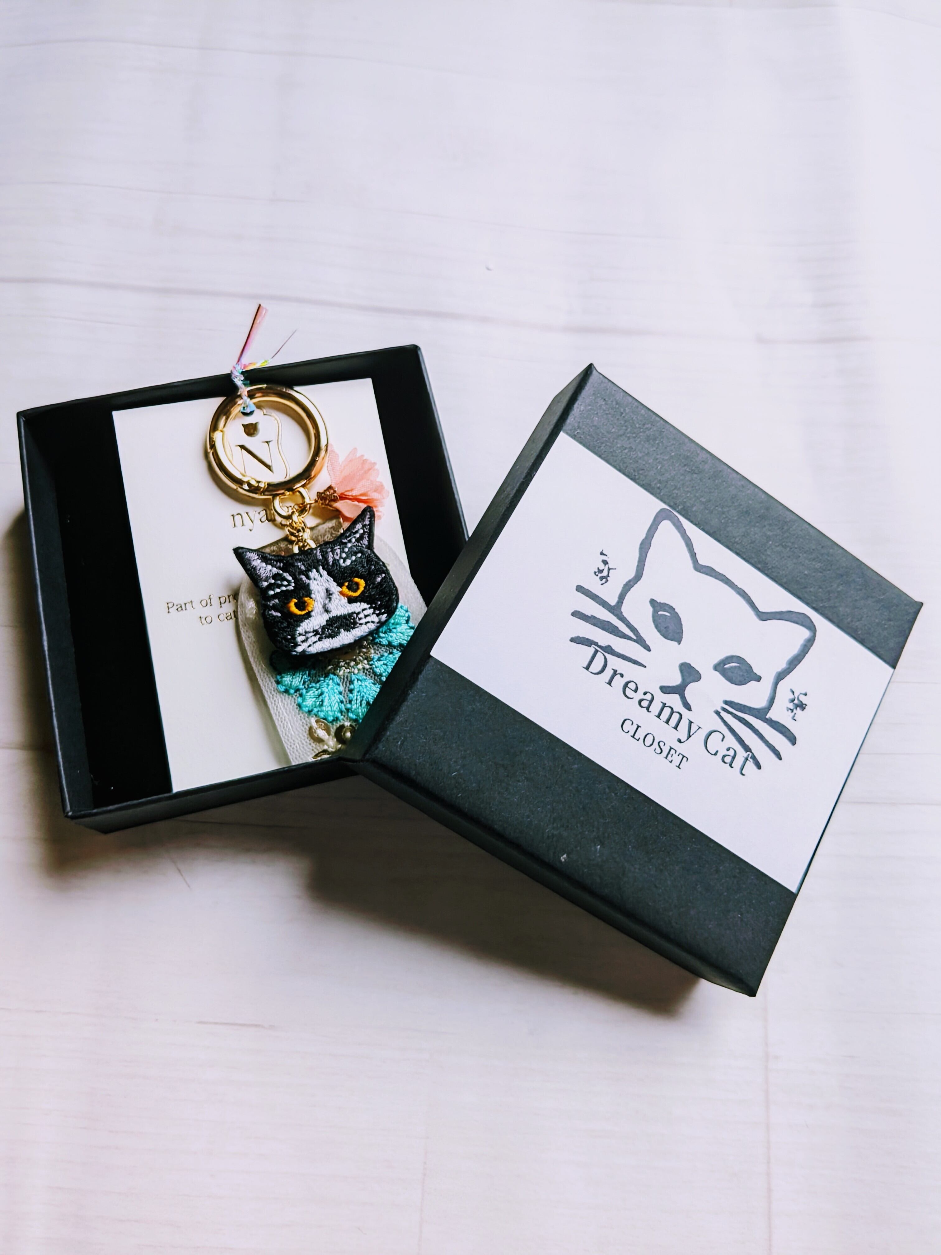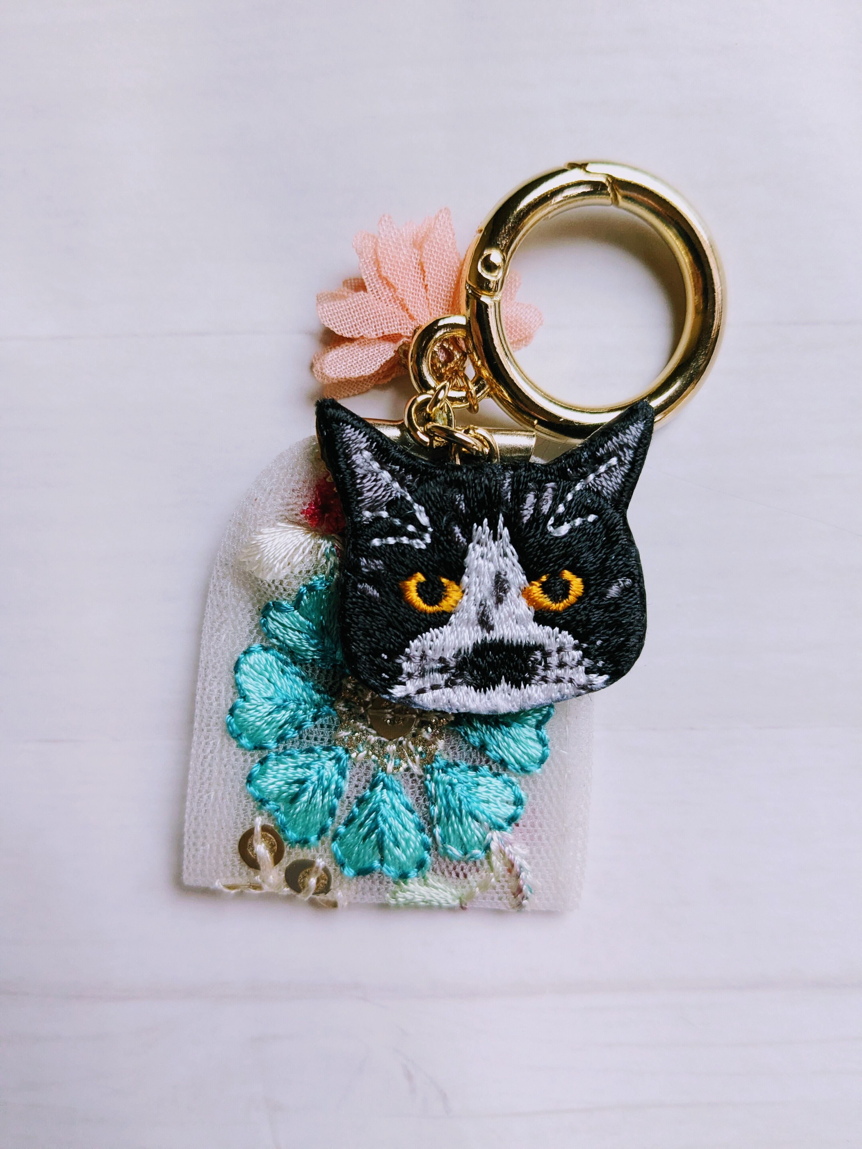 深い色合いと繊細な刺繍、ひと針ごとに想いを込めて仕立てられた一点もので、猫好きさんの心をくすぐるデザインです。