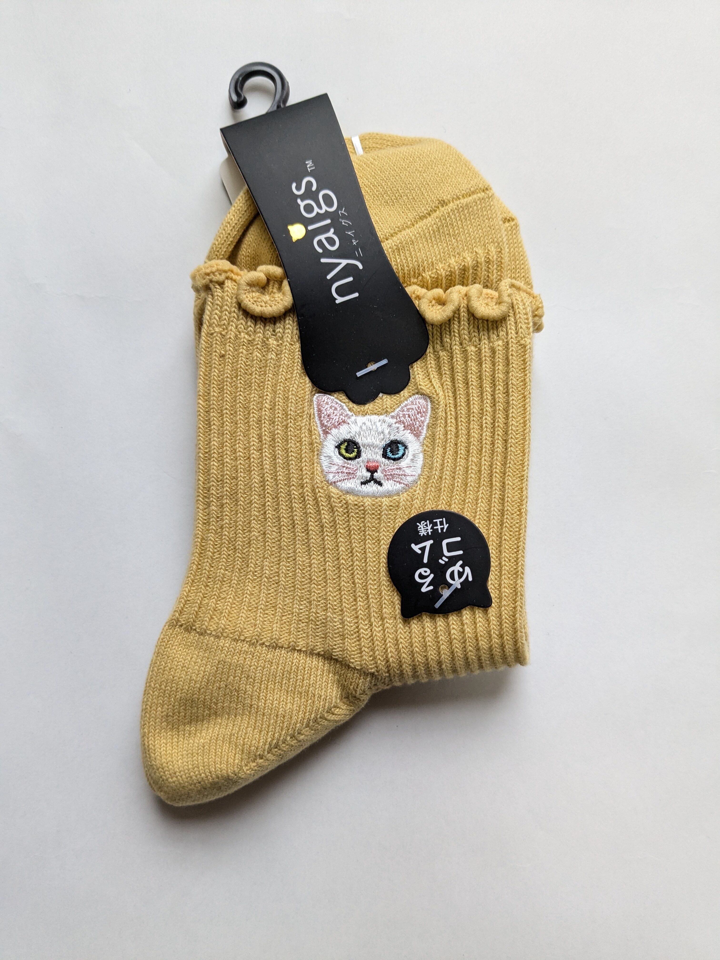 美しいオッドアイの白猫「みるくちゃん」をモチーフにした刺繍が魅力の靴下です。みるくちゃんは、ふわふわの毛布でふみふみするのが大好きな、ちょっぴりつんデレな猫娘。刺繍は毛並みまで丁寧に表現されています。