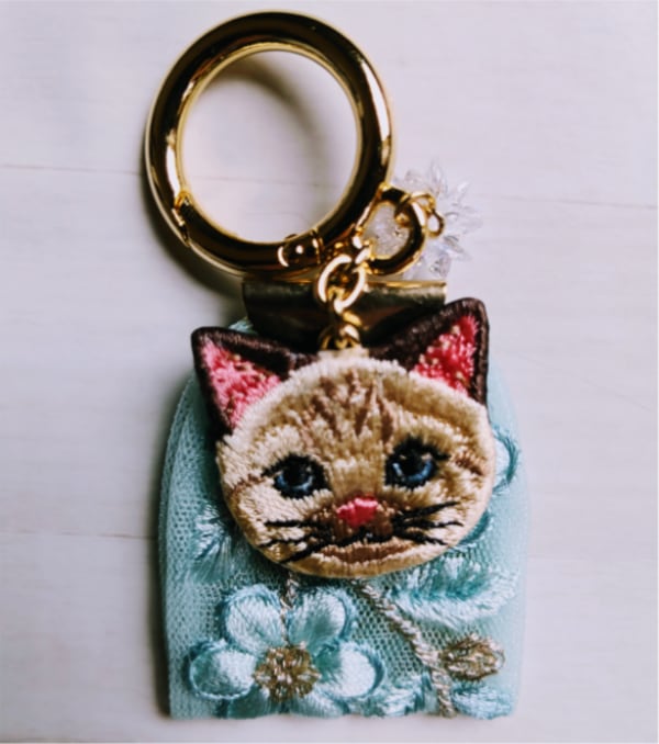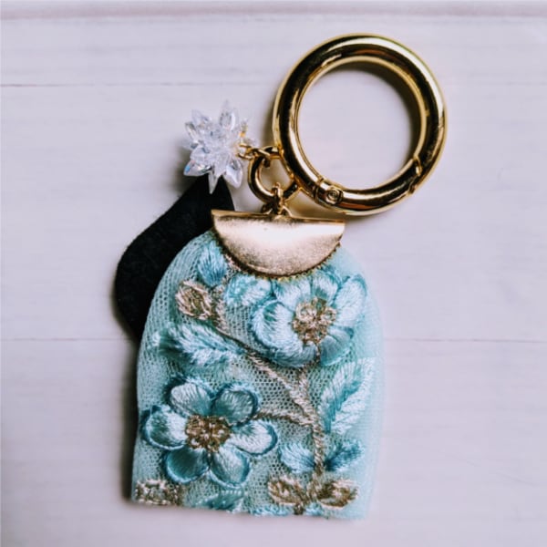 一つ一つ繊細な刺繍で表現された表情と、ゴールド金具やクリアフラワーのきらめきが上品で、バッグや鍵、パスケースにつけるだけで気分がふわっと明るくなるデザイン。