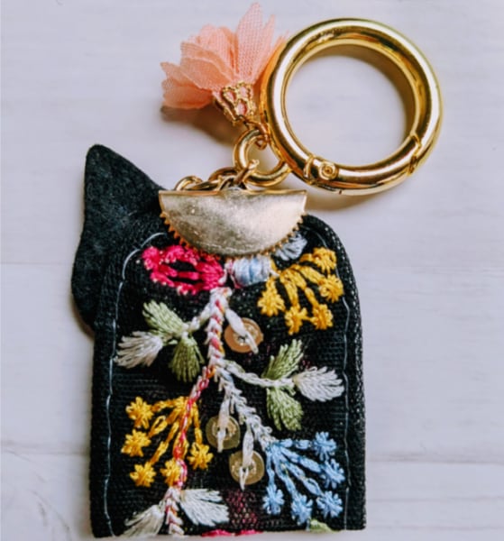 漆黒の生地に咲いた深い紅花は、夜空に浮かぶ花火のように、持ち主の一日をぱっと明るく彩ってくれるおまもりチャームです。