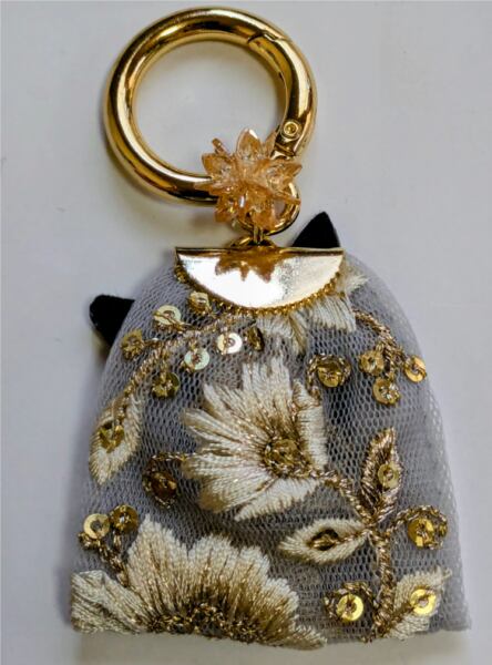 やわらかなアイボリーの生地に咲く金色の花々とともに、まるで光をまとったような存在感で、そっとあなたを見守ってくれるおまもりチャームです。